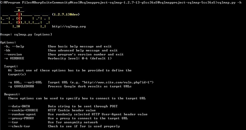 sqlmap의 다른 옵션을 확인하려면 -h 옵션을 사용합니다.