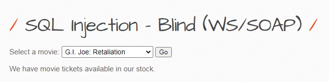 sqli_5.php는 선택한 영화에 남아 있는 티켓 수를 출력하는 페이지로, 티켓 수 출력에 SOAP를 활용하여 예매 가능한 티켓 수를 사용자에게 보여 줍니다. sqli_5.php 페이지에서는 SOAP 기능을 통하여 Boolean Based SQL 인젝션이 가능하며, Time Based SQL 인젝션도 가능합니다.