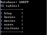 이미 데이터베이스가 bfh 시작한다는 정보를 알고 있으므로 -D 옵션으로 데이터베이스를 'bWAPP'로 지정하도록 하겠습니다. 그다음 bWAPP의 테이블 내용을 파악하기 위하여 --tables 옵션을 사용하도록 하겠습니다.