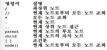 XML은 노드들로 이루어져 있고 Xpath로 데이터를 호출합니다. Xpath에서 사용하는 명령어는 아래와 같습니다.