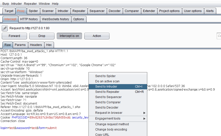 Burpsuite Proxy 탭에서 HTTP 요청을 가로챈 다음 Intruder로 보냅니다. Intruder로 보낼 때는 가로챈 요청의 내용이 보이는 창에서 오른쪽 마우스 버튼을 클릭한 후 'Send to Intruder' 메뉴를 선택하여 줍니다.