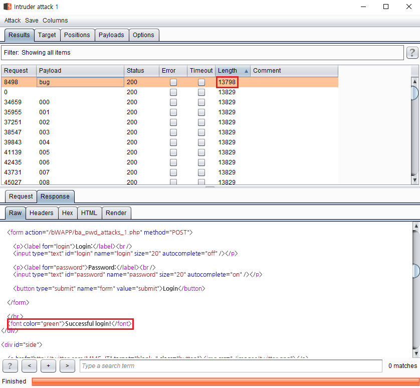 공격 결과를 살펴보면 공격중 결과 값이 다르게 나오는 Payload가 있습니다. 보통 상태 코드가 다르거나 다른 Payload와 길이가 차이가 납니다. 결과 값이 다른 Payload를 발견하면 결과 페이지 하단에 있는 [Response] 탭에서 [Raw], [Rander] 탭을 확인합니다. 여기서는 Length 기준으로 정렬을 하면 결과 값이 다른 하나를 확인할 수 있으며 Raw 탭을 살펴보면 Successful Login! 문구를 확인할 수 있습니다. 그러므로 비밀번호는 "bug"라는 것을 알 수 있습니다.