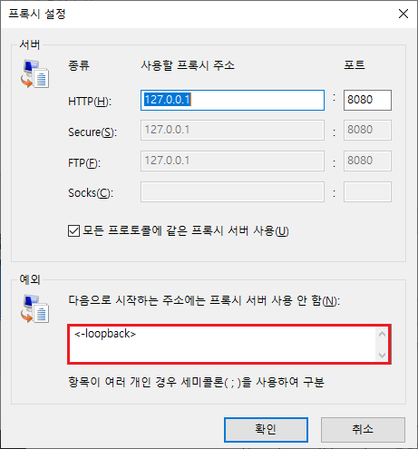 4) 프록시 설정 창의 예외 부분에 "<-loopback>" 입력후 확인