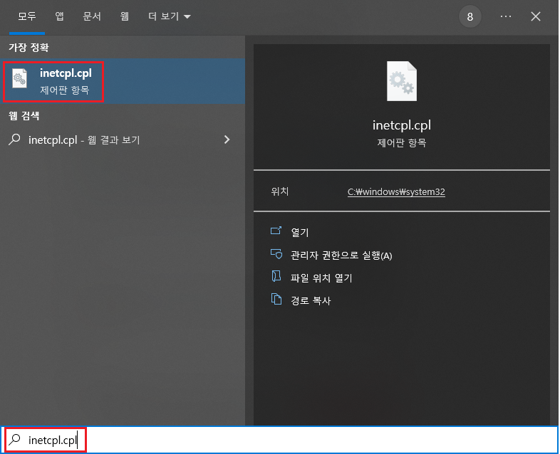 1) 실행창에서 "inetcpl.cpl"을 입력 또는 브라우저 창에서 인터넷 옵션을 선택 하여 줍니다.