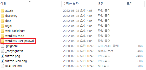 fuzzdb-master.zip 파일을 압축을 해제한 다음 wordlists-user-passwd 하위에 있는 passwds 디렉터리에서 'phpbb.txt' 파일을 사용하도록 하겠습니다.