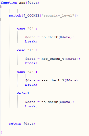 xss_get.php 페이지의 소스 코드를 확인하면 xss_check_3 함수를 사용하여 입력 데이터 값을 우회합니다.