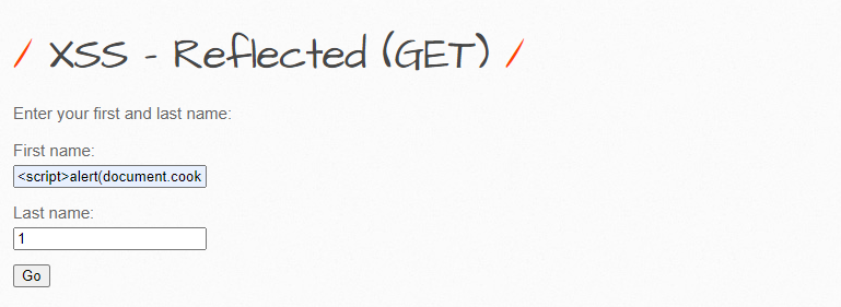Reflected Cross-Site Scripting 취약점이 있는 'xss_get.php' 페이지의 메인 화면입니다.