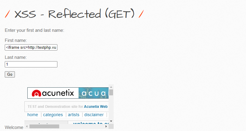 <iframe src=http://testphp.vulnweb.com < iframe을 이용하여 해당 웹 페이지 안에 어떠한 제한 없이 또 다른 하나의 웹 페이지를 삽입할 수 있습니다.