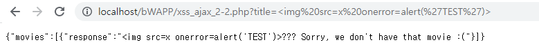 xss_ajax_2-2.php 페이지의 title 변수에 값을 입력후 웹 페이지를 접속해보면 JSON 형식으로 입력한 값이 출력되는 것을 확인할 수 있으며, xss_ajax_2-1.php 페이지에서 문자열을 출력하는 스크립트 코드를 입력하거나 웹 페이지에서 검색하면 xss_ajax_2-2.php 페이지로 값이 전달되므로 xss_ajax_2-1.php 페이지에서는 스크립트 실행을 확인 할수 없습니다.