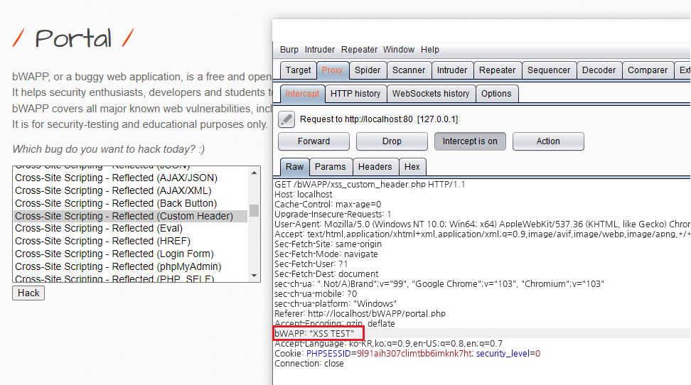 xss_custom_header.php 페이지를 요청할 때의 패킷을 확인해야 되므로, 비박스 메인 페이지에서 Cross-Site Scripting -Reflected (Custom Header)를 선택하고 Hack 버튼을 눌렀을 때 패킷을 잡아 줍니다. 패킷을 잡은 후 HTTP 헤더 부분에 사용자 지정 헤더인 bWAPP:를 추가하여 값을 넣어 주었습니다. (bWAPP: "XSS TEST")