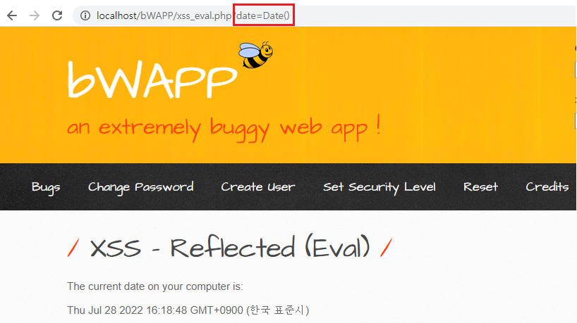 xss_eval.php 페이지를 살펴보면 현재 컴퓨터의 날짜와 시간이 표시되는 것을 확인할 수 있습니다. 취약점을 찾기 위하여 페이지를 살펴보도록 하겠습니다.