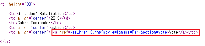 xss_href-2.php 페이지에서 마우스 우클릭하여 페이지 소스보기를 하시면 Vote는 <a> 태그를 사용하여 href 속성으로 xss_href-3.php 페이지로 연결합니다.