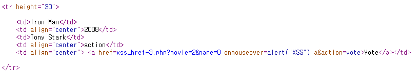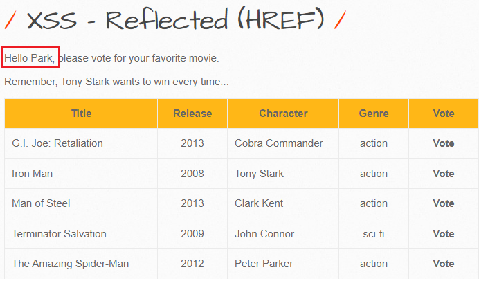 Iron Man Vote를 클릭하면 xss_href-3.php 페이지로 연결이 되는 것을 알 수 있습니다. xss_href