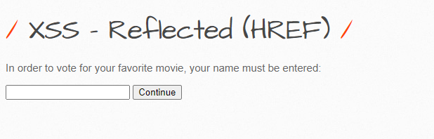 xss_href-1.php 페이지를 확인해 보면 좋아하는 영화를 투표하려면 이름을 입력하세요라는 메시지와 입력창을 확인할 수 있습니다. 그럼 이름을 입력해 보도록 하겠습니다.