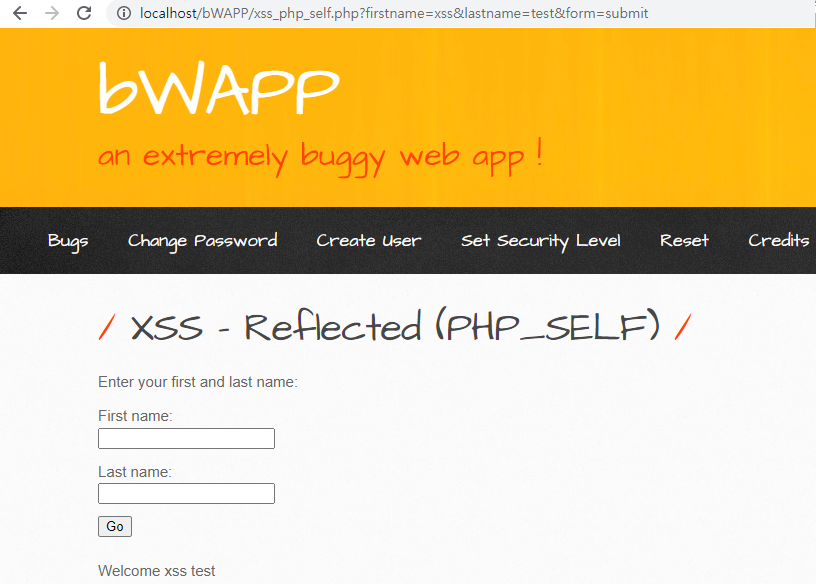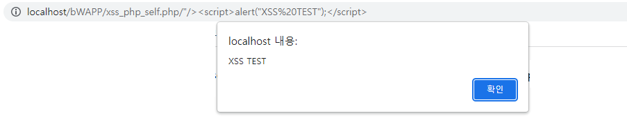 xss_php_self.php 페이지의 소스코드를 확인해 보면 HTML 폼 태그의 action 속성에서 $_SERVER['PHP_SELF']를 사용하여 현재 페이지의 경로를 반환합니다. PHP_SELF에서 반환하는 실제 경로로 표시하면 <form action="<?php echo xss((http://localhost/bWAPP/xss_php_self.php));?>" method="GET">가 될 것입니다.