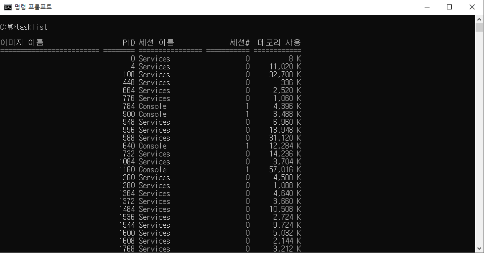 - tasklist 명령은 현재 실행 중인 로컬 컴퓨터 프로세스들을 모두 표시하여 줍니다.