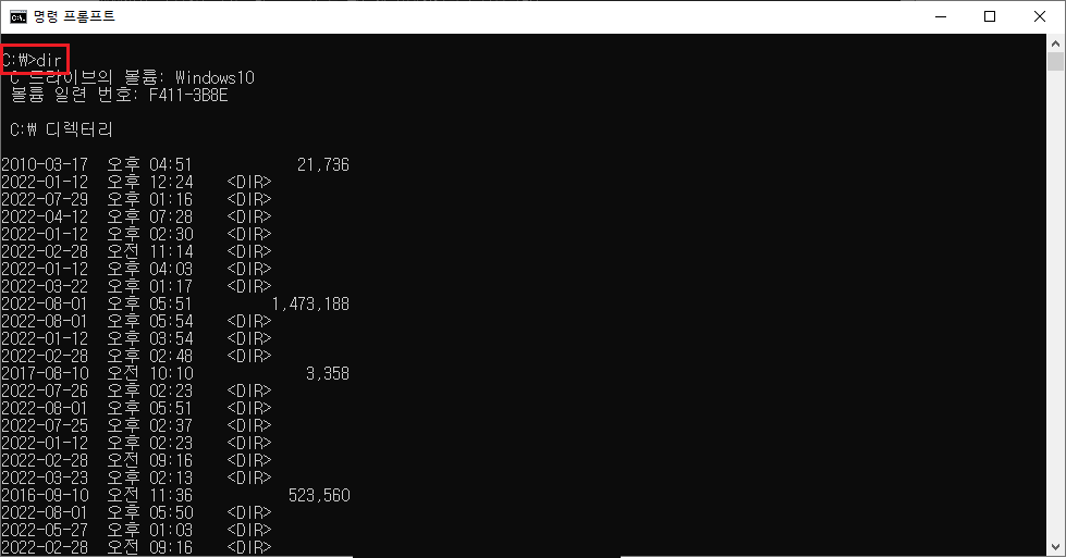 - dir 명령은 경로의 폴더 및 파일의 내용을 확인할 수 있습니다.