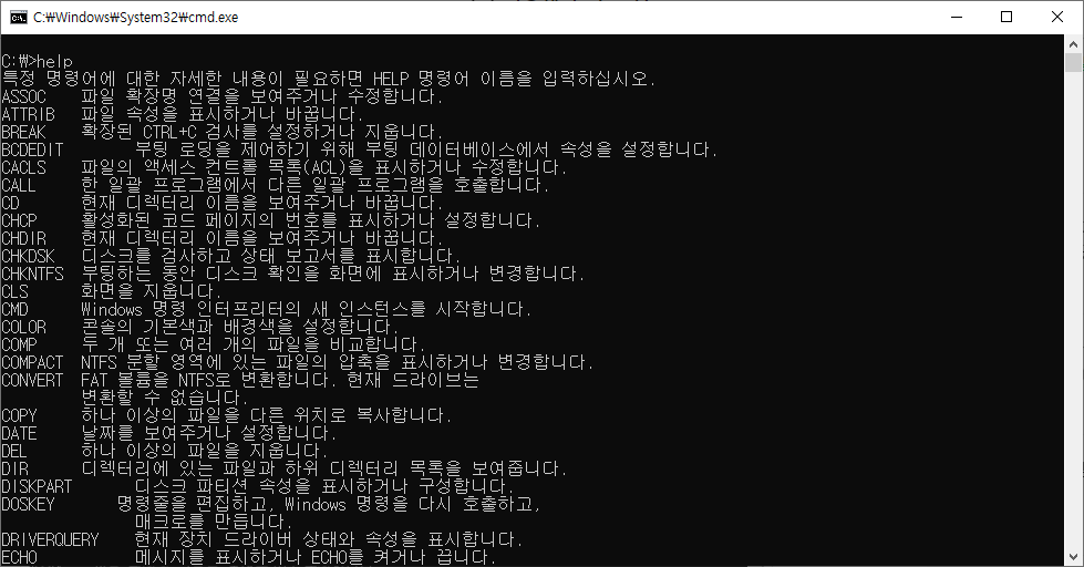 자주 사용하는 CMD 명령어를 알아 보기 전에 CMD 창에서 help를 입력하면 기본 명령어들을 확인할 수 있으니 참고하시면 되겠습니다. 그럼 저의 기준으로 자주 사용하는 명령어들을 한번 알아보도록 하겠습니다.