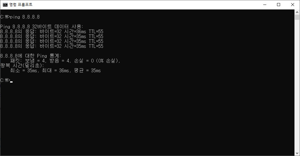 - ping 명령어의 설명과 사용 옵션을 보려면 ping/? 로 확인이 가능합니다.