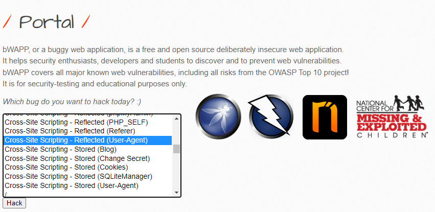 xss_user_agent.php 페이지는 User-Agent 헤더에 Cross Site Scripting 공격이 가능한 취약점을 담고 있습니다. 취약점을 확인하기 위하여 프록시 도구를 사용하도록 하겠습니다.