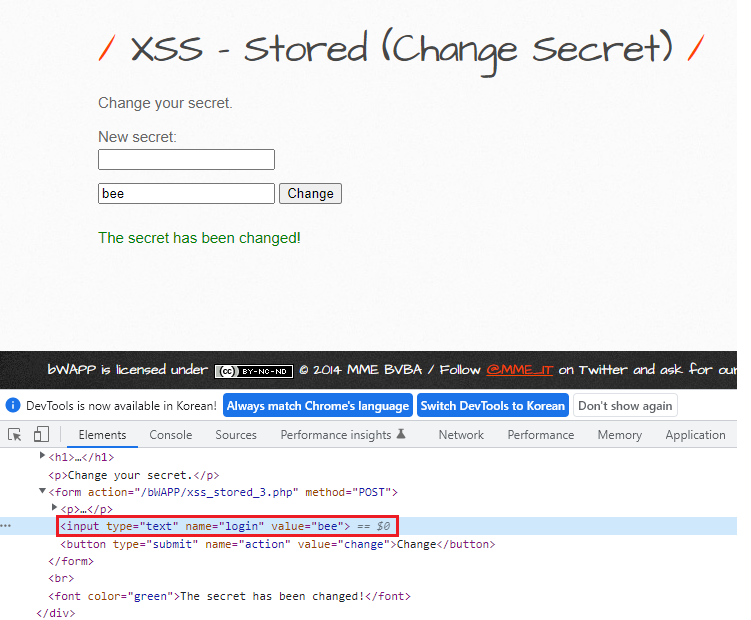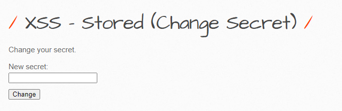 xss_stored_3.php 페이지의 New secret 입력창에 스크립트 구문을 입력하고 Change 버튼을 눌러 주었습니다.