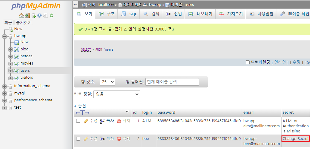 phpMyAdmin 페이지에 로그인을 한뒤 users 테이블에서도 확인이 가능합니다. 그럼 다시 xss_stored_3.php 페이지에서 비밀번호 힌트를 바꿔 보도록 하겠습니다.
