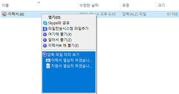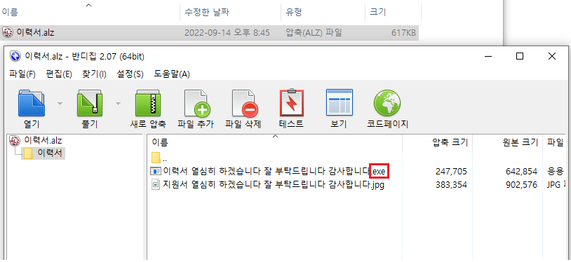 zip으로 압축된 파일을 패스워드를 입력하여 풀면 alz로 압축된 파일이 확인이 되는데 마우스 우클릭하여 압축 파일 미리 보기를 선택하면 확장자가 .exe 실행 파일이라는 것을 확인할 수 있습니다.