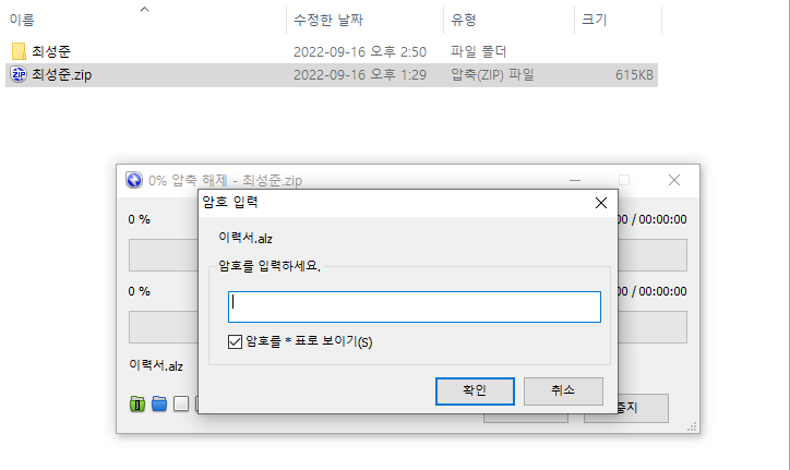 압축해제 시 패스워드 입력창 확인
