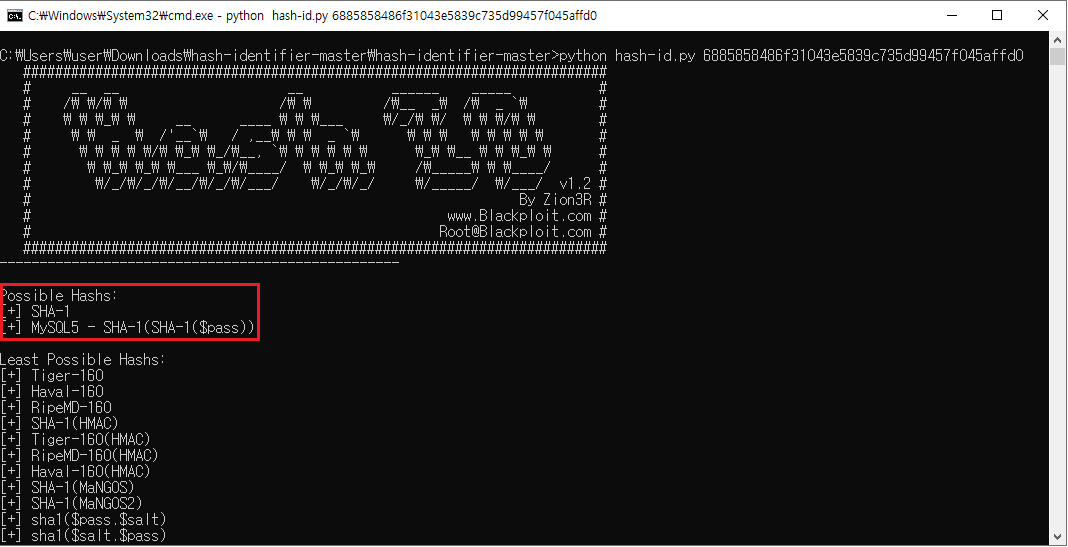 그럼 먼저 해시 함수의 유형을 살펴보도록 하겠습니다. (https://github.com/blackploit/hash-identifier)
