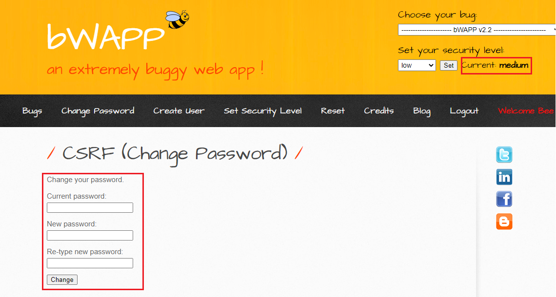 먼저 패스워드를 변경하는 CSRF 공격을 하기 위해서는 비박스에서 A1 HTML Injection - Stored (Blog) 페이지 또는 A3 XSS - Stored (Blog) 페이지를 이용해야 합니다. 여기서는 A3 XSS - Stored (Blog) 페이지를 이용하여 진행해 보도록 하겠습니다.