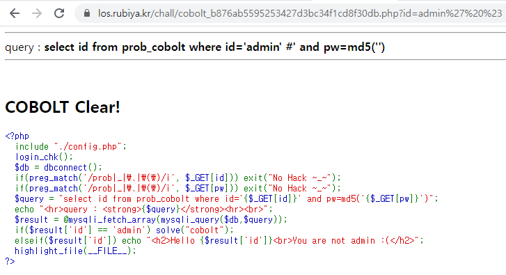 select id from prob_cobolt where id='admin' AND 1=1 #' and pw=md5('')