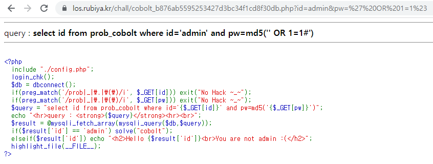 select id from prob_cobolt where id='admin' and pw=md5('' OR 1=1#')