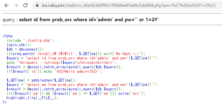 select id from prob_orc where id='admin' and pw='' or id='admin' and length(pw)=1#'