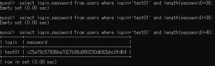 login test'01 값에 백슬래시(\)를 포함시켜 문자열로 처리하였더니 에러표시가 나지 않는것을 확인할 수 있습니다. login 값에 test'01 값이 없으므로 값은 출력되지 않습니다.