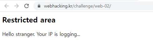 webhacking.kr의 2번 문제를 살펴보면 제한된 영역, IP를 기록하고 있다는 메시지를 확인할 수 있습니다. 해당 문제의 단서를 찾기 위해 한번 살펴보도록 하겠습니다.