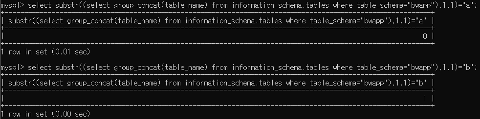 bWAPP DB를 예시로 DB의 첫 번째 글자가 "a"인지, "b"인지 쿼리를 하였을 때의 값입니다.