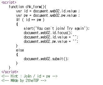 소스에 script 부분을 보시면 chk_form() 함수를 사용하여 id값과 pw값을 불러와 비교를 하는걸 보실수 있으십니다.