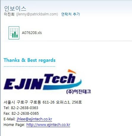 메일을 보시면 이진테크라는 회사를 사칭해 대량으로 악성 메일이 유포되고 있습니다. 첨부파일에는 .xls, .WIZ 파일이 각각 포함되어 있습니다.