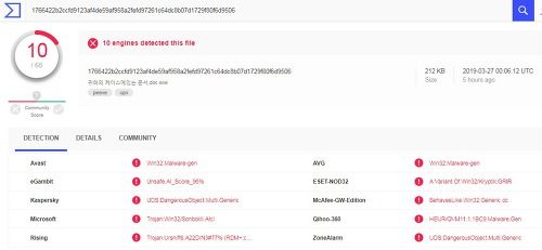 바이러스토탈 확인결과 해당 파일에 대하여 백신에서 탐지 비율이 낮으므로 더욱더 주의가 필요하며, 최신 백신 업데이트가 필요할 것으로 보입니다.