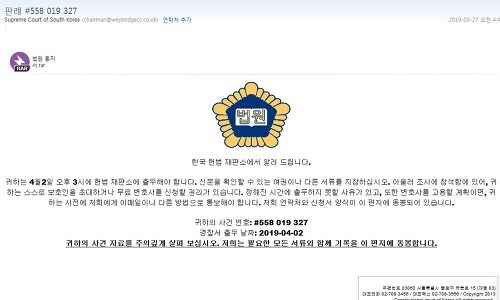 메일을 보시면 법원 통지서.rar 이라는 첨부파일을 포함하고 있으며, 메일 본문에는 헌법 재판소에 출두하라는 내용이 포함되어 있습니다.