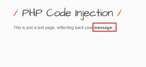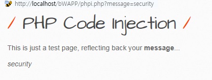 PHP Code Injection 페이지에 접속하신후 URL을 확인해 보시면 해당페이지는 'phpi.php' 페이지라는 것을 알수 있으며, 'message'라는 굵은 글씨가 보이실겁니다. 여기서 'message'라는 굵은 글씨를 클릭하시면 'test'라는 문자열을 페이지에 출력하는 것을 확인할수 있습니다.