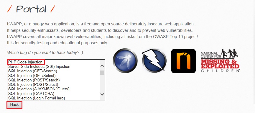 비박스 로그인을 하신후 PHP Code Injection을 선택해 주신후 [Hack] 버튼을 눌러 줍니다.