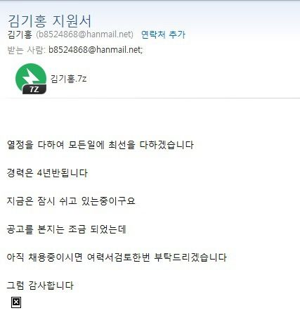 보안분석 : 입사지원서를 위장한 첨부파일(.7z) 악성메일 유포 주의 추가 (2019.10.08)