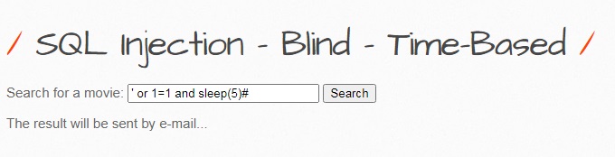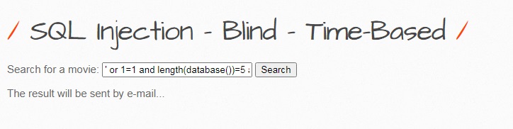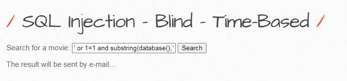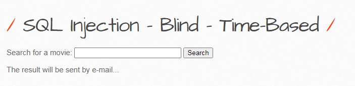 해당 페이지는 영화 검색을 할수 있으며, 검색 결과를 이메일로 보내는 기능을 합니다. 여기서 알수 있는것은 참, 거짓에 상관없이 검색 결과는 모두 동일한 메시지를 출력하는 것을 알수 있으며, 참을 구별 하기 위해여 sleep 함수를 사용하여 인젝션을 시도하도록 하겠습니다.