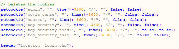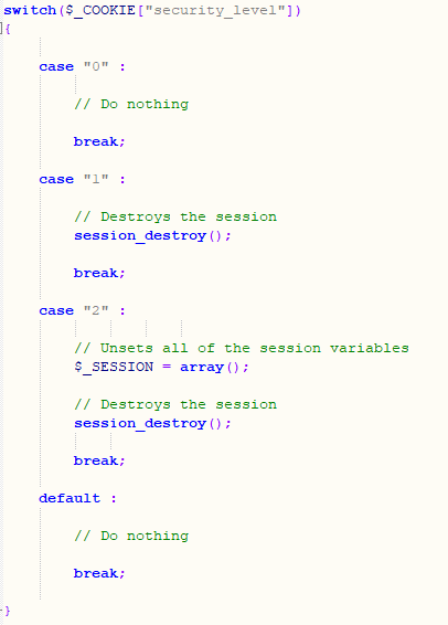위의 코드에서 난이도 중(case "1")인 경우에는 session_destroy() 함수만 호출하고, 난이도가 상(case "2")인 경우에는 $_SESSION = array(); 수행 후, session_destroy() 함수를 호출해주고 있는데 여기서 $_SESSION = array(); 는 세션 변수를 비우는 코드로 session_unset() 함수의 기능과 같습니다.
