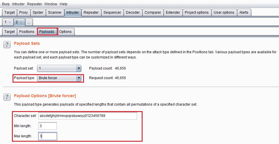 Payloads 탭으로 이동하여 공격 타입을 지정하여 줍니다. 무차별 대입 공격을 시도하므로 'Brute forcer'로 공격 타입을 바꿔 줍니다. 공격 타입을 바꾼 다음 옵션을 선택하여 주는데 사용자 'bee'의 비밀번호가 3 글자인 것을 알고 있으므로 'Min length' 옵션을 3으로 지정합니다. 이외에 사용 가능한 옵션으로는 'Character set', 'Max length'가 있는데 'Character set'는 무차별 대입 공격에 사용할 문자 종류를 지정하고, 'Max legnth'는 대입 문자의 최대 길이를 지정합니다.
