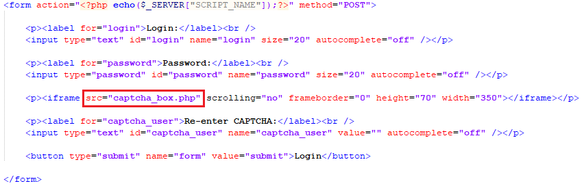 'ba_pwd_attacks_4.php' 페이지의 소스 코드를 확인하면 로그인 기능과 함께 캡챠 이미지를 제공하는 'captcha_box.php'를 호출하는 것을 알 수 있습니다.